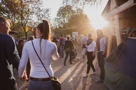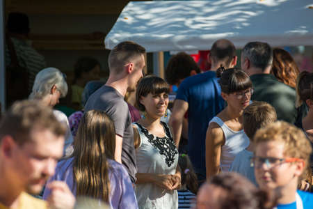 Moscow, Russia - August, 2018: people walking at outdoor festival- Veter Summer Festival in Moscow