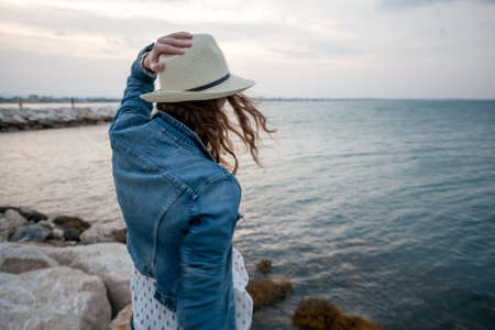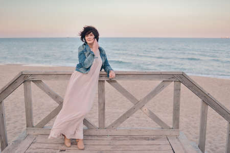 Pleased charming young woman at windy seacoast enjoy vacation. Pretty girl rest on evening sea beach with blue sky after sunset