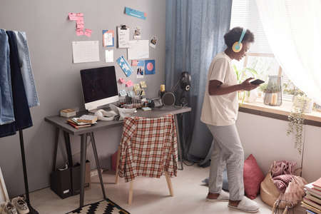 African young woman in wireless headphones using her mobile phone to listen to music in the room