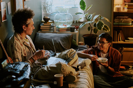 Roomies eating Chinese noodles while spending free time with each other talking about future startup