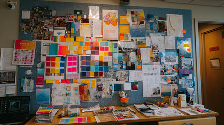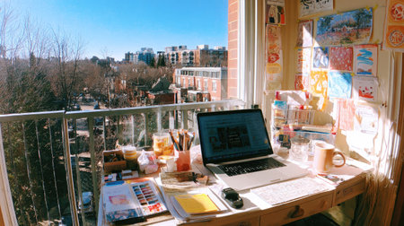 A young woman engages in studying at her cozy desk, surrounded by notes and papers bathed in warm sunlight. The serene ambiance promotes focus and creativity.