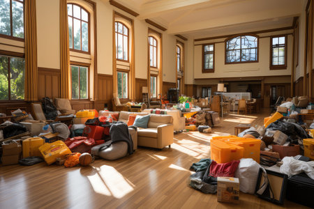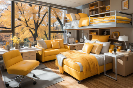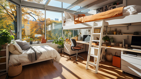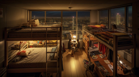a dorm room with bunk beds, personal items, and study materials, created with generative ai