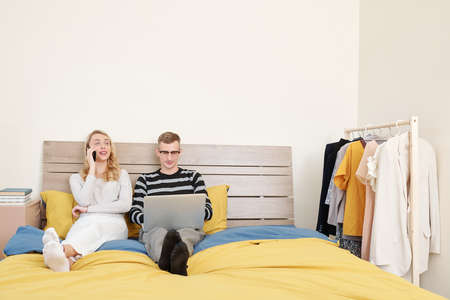 Couple staying in bed all day, man working on laptop and woman making phones call to clients