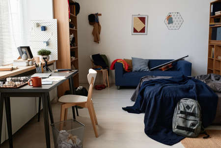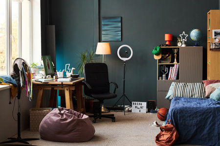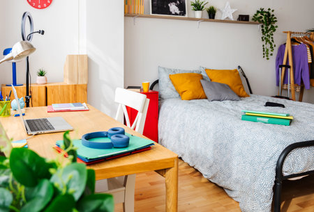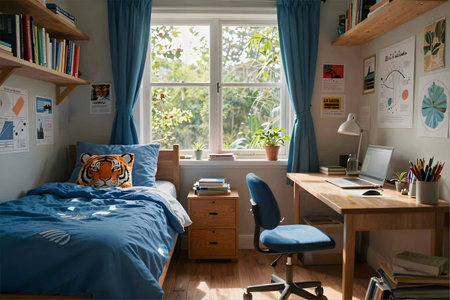 Teenage bedroom with bed, desk and study space in cozy home interior
