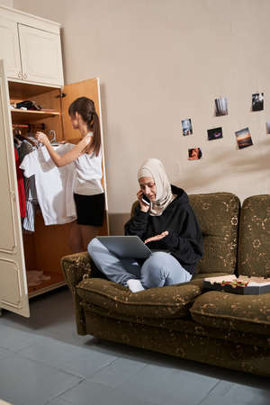 Two student girls unpack things in a dorm room. Girls chatting and laughing. Horizontal photo