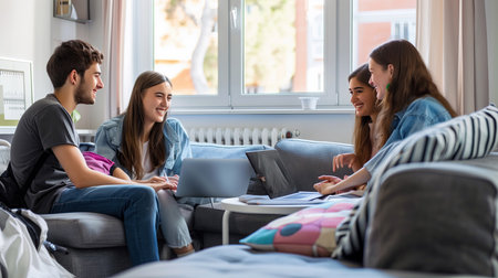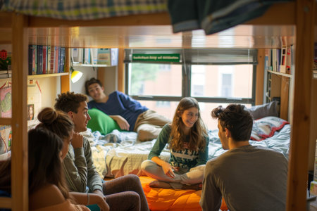 A group of friends chatting and socializing in a dorm room setting, Group of friends chatting in a dorm room