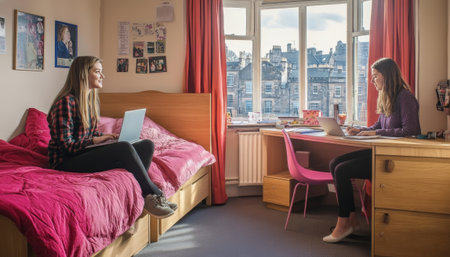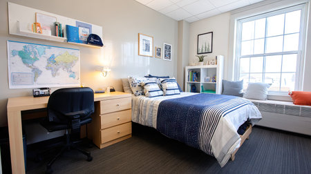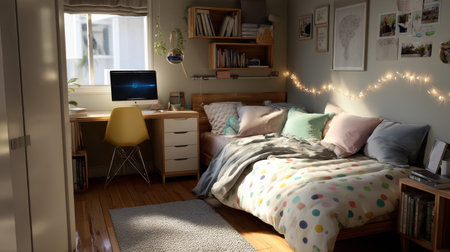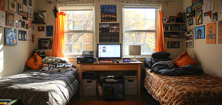 Warmly decorated student dorm room with twin beds, desk, and colorful posters. Sunlight streaming through windows gives a cozy, comfortable feel.