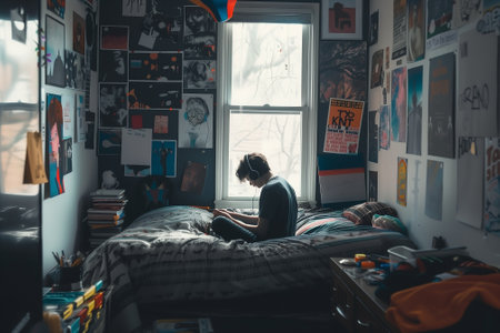 Focused Male Student Working on Homework at a Cluttered Desk, Surrounded by Posters and Notes in His Warmly Lit University Dorm Room.