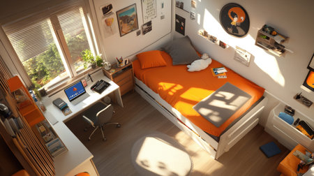 A cozy bedroom scene featuring a comfortable bed with an orange blanket, a laptop on a wooden desk, and various personal items arranged thoughtfully.