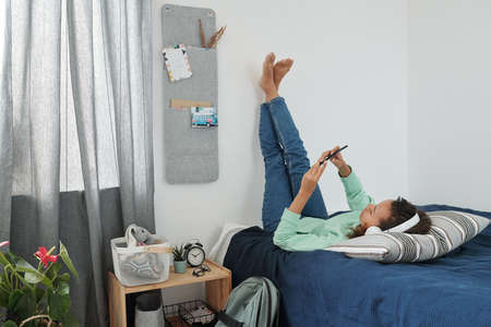 Relaxed mixed-race girl in headphones and casualwear using smartphone on bed