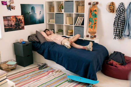 Young man lying on bed among shelf with books and skateboards while having rest and thinking