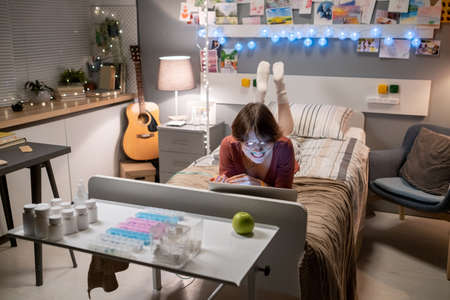 Sick teenage girl lying on the bed and watching something on digital tablet before sleep at hospital ward