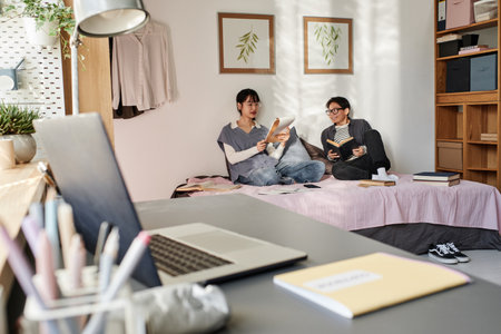 Focus on background: positive young Asian couple testing each other while preparing for exam together in cozy room