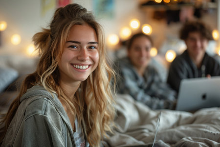 Students spending free time in college dormitory. Smiling woman with her friends gathered in student dorm room, Friends life in university campus