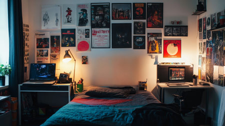 Artistic bedroom with colorful bedding, multiple workstations, and walls covered in movie posters and artwork, showcasing a personalized creative space for digital artists.