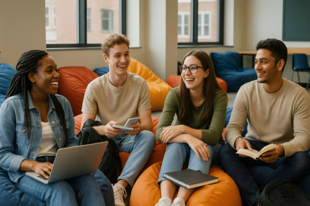 Four cheerful university students are sitting on beanbag chairs, laughing and enjoying their time together in a break from studying