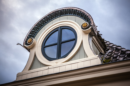 Vertical Large triple dormer window in an urban house for an attic room against a blue sky
