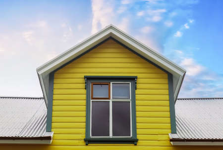 Three white vintage windows, little room decoration on the roof of the big white wooden house on blue sky background with copy space, view from outside.