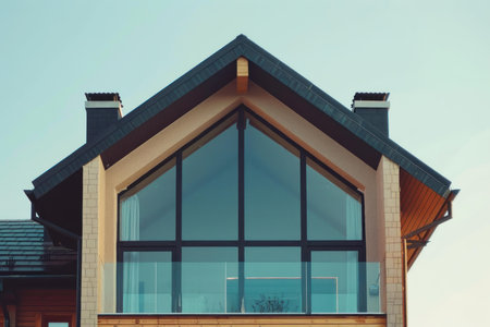 Residential building roof highlights modern windows amid suburban setting architecture features clean lines, neutral tones