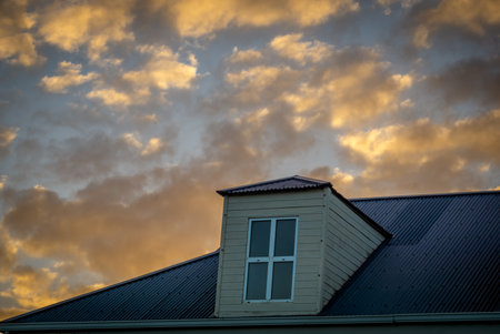 Modern house roof with dark grey shingles and a dormer vent, reflecting warm light from a dramatic sunset sky. silhouetted trees and an outdoor lamp complete the evening scene.