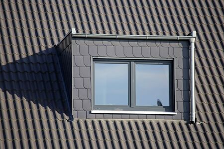 A sharp, modern dormer window with a clean white frame stands out against the textured red tiles of a classic pitched roof, set against a bright, overcast sky.