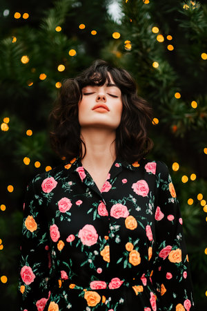 Pensive Spanish adult woman with eyes closed in floral print dress near pine tree.