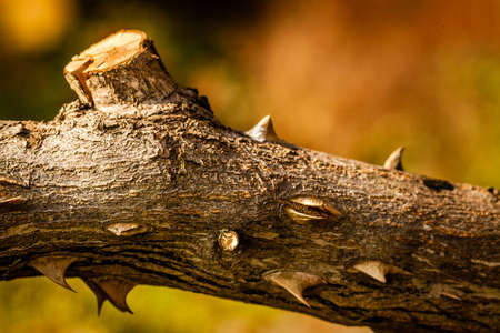 A selective focus shot of a thorny branch of a plant
