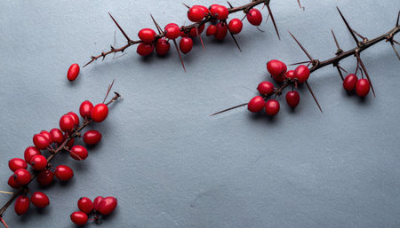Barberry berries dotted along thorn twigs on graphite ground with a minimalist winter palette calm editorial background for seasonal food wellness and design