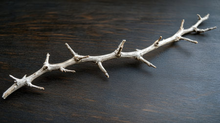 A dry tree branch rests on a dark wooden background, highlighting intricate textures and natural beauty, ideal for nature-themed projects or rustic decor.