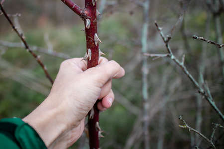 Female hand holds a prickly plant branch