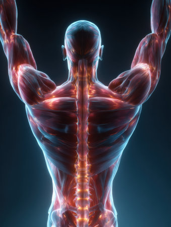 Stunning portrayal of back muscular anatomy, showing muscle fibers and spine, with soft lighting to highlight details.