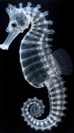 A close up of a sea horse on a black background, monochromatic x-ray image on dark background