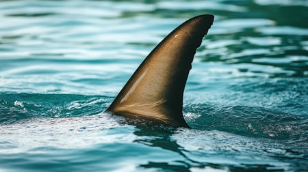 A mesmerizing shot capturing the silhouette of a shark fin emerging from calm ocean waters, reflecting the glimmers of soft sunset light.