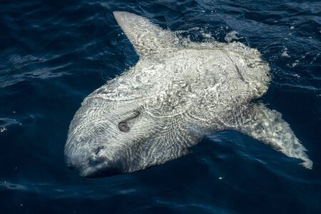 Mola mola sun fish on sea surface while eating velella jellyfish