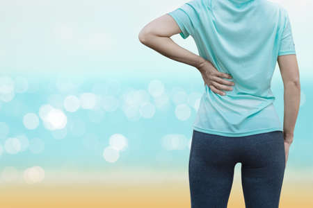 A young woman is run on the beach in the morning and having back pain.