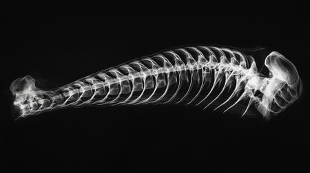Close-up X-ray of a human back with detailed spine structure. High-resolution radiograph of vertebral bones. Concept of orthopedic diagnostics, spinal health, and anatomical precision.