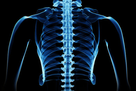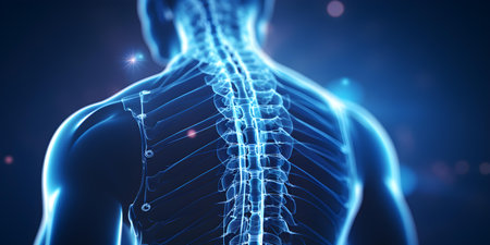 A digital illustration of a human spine and rib cage with a blue glow on a dark background, highlighting the structure of the torso. spinal health in overall well-being. High quality photo