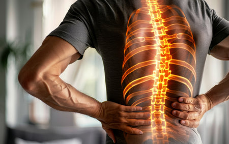 A man is clutching his lower back in pain, with a vivid illustration of a glowing spine superimposed to indicate discomfort. The image captures the struggle with back issues effectively