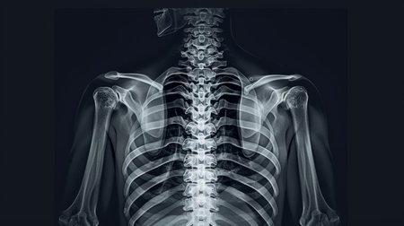 X-ray showing human thoracic skeleton and rib cage. Concept of medical imaging, bones structure, healthcare diagnostics, skeletal anatomy.