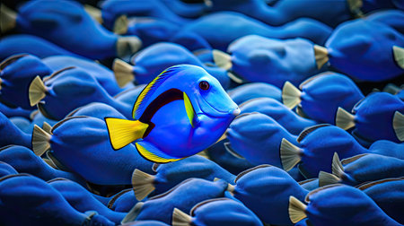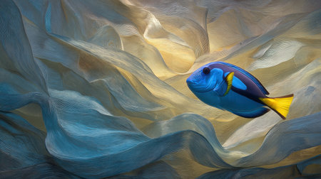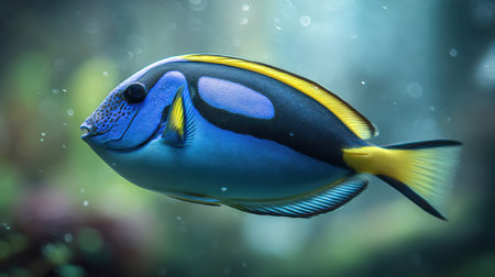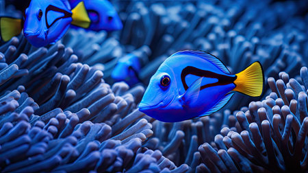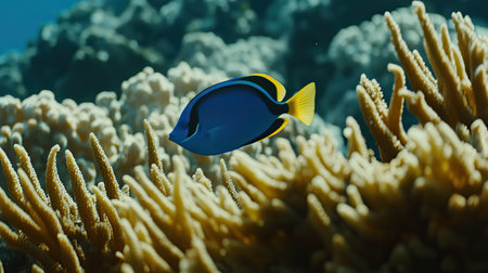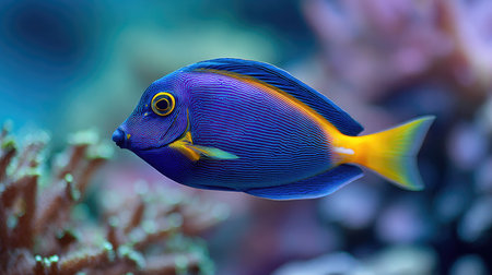 This image features a vibrant blue tang tropical reef fish swimming gracefully in clear ocean water surrounded by soft coral formations captured with exceptional detail 4K AI