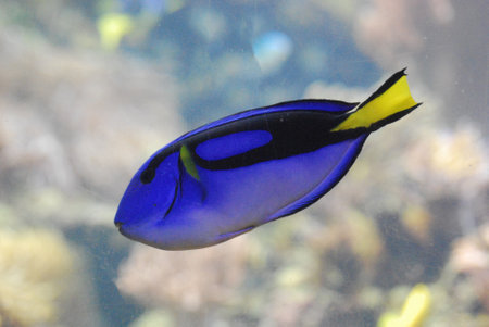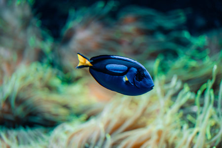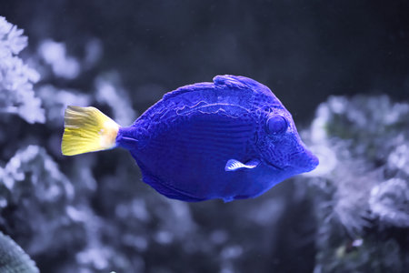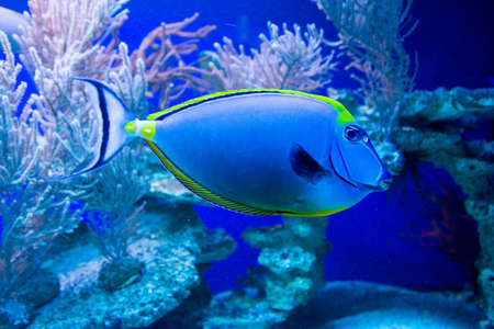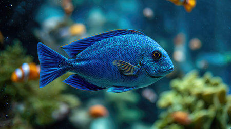 A close-up captures a bright blue fish swimming within a richly colored aquarium. The fish exhibits a sleek form and reflective scales, set against the backdrop of vibrant coral and other aquatic life. The scene is illuminated, suggesting a well-lit underwater environment suitable for a range of editorial and commercial applications.