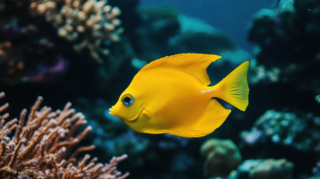 A vivid yellow fish glides among coral formations, showing its vibrant colors. The underwater world busts with life, creating a stunning display of marine biodiversity..