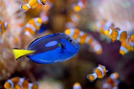 Paracanthurus hepatus, Blue tang in Home Coral reef aquarium. Selective focus. High quality photo