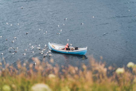 Two traditional boat with fisherman in a natural harbour, Faroe Island