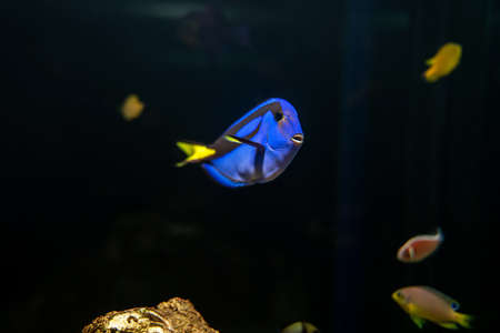 Blue Tang fish swims in a large aquarium with other fish