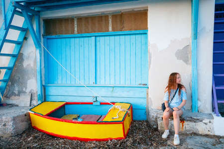 Adorable teenage girl enjoying visit to colorful fishing village of Klima on the island of Milos in Greece