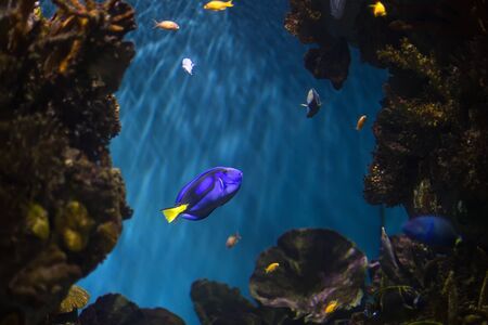 Paracanthurus hepatus surgeon fish. Wonderful and beautiful tropical fish with corals reef in the aquarium. Nature forest design tank with fresh water, underwater world. Animal life