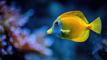 A close-up view presents a yellow tang fish, its body a bright yellow with blue accents, navigating a blurred aquatic environment. The composition highlights the fish's form against a backdrop of soft corals and deep blue water. Suitable for illustrating marine life, educational content, or artistic projects.