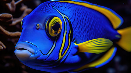 Yellow tropical fish with pattern and coral reef in sea, created using generative ai technology. Fish, animals and nature concept, digitally generated image.