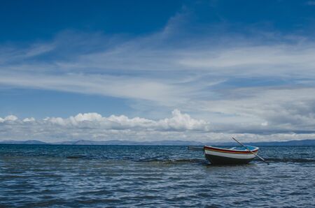 empty boat with an oar in the sea with the sky, clouds, calm and peace